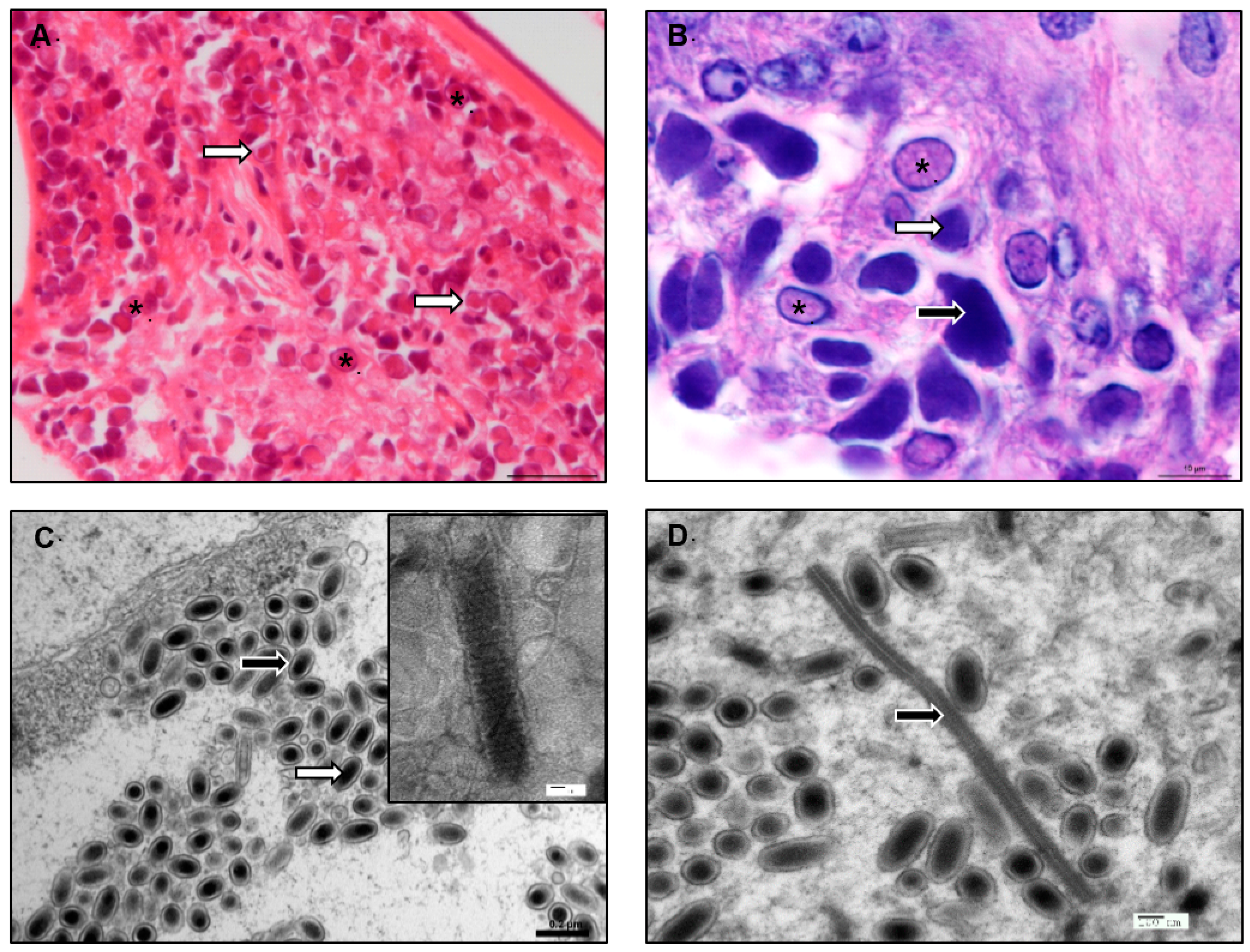 White Spot Syndrome Virus (WSSV) infection of Litopenaeus vannamei. The infection progresses through different stages that can be seen in the nucleus via histology. (A) Early-stage infected cells display enlarged nuclei with marginalized chromatin and a homogenous eosinophilic central region. These then develop an intranuclear eosinophilic Cowdry A-type inclusion (*); this can be surrounded by a clear halo beneath the nuclear membrane (white arrow). Scale bar = 25 µm; (B) The eosinophilic inclusion usually expands to fill the nucleus (*). This inclusion becomes basophilic in staining and denser in color as the infection progresses (white arrow). Nuclei then disintegrate so that the content fuses with the cytoplasm (black arrow). Scale bar = 10 µm. H & E stain; (C) WSSV virions appear ovoid in shape and contain an electron-dense nucleocapsid (white arrow) within a trilaminar envelope (black arrow). Scale bar = 0.2 µm. Inset. Negatively stained WSSV nucleocapsid, showing the presence of cross-hatched or striated material that is structured as a series of stacked rings of subunits and is a key diagnostic feature of WSSV. Scale bar = 20 nm; (D) Presumptive nucleocapsid material within the nucleus prior to envelopment. This material is cross-hatched or striated in appearance and linear prior to its incorporation in the formation of mature WSSV particles. This linear nucleocapsid material is observed sporadically in the manufacture of the WSSV particles. Scale bar = 100 nm. Transmission electron microscopy images.