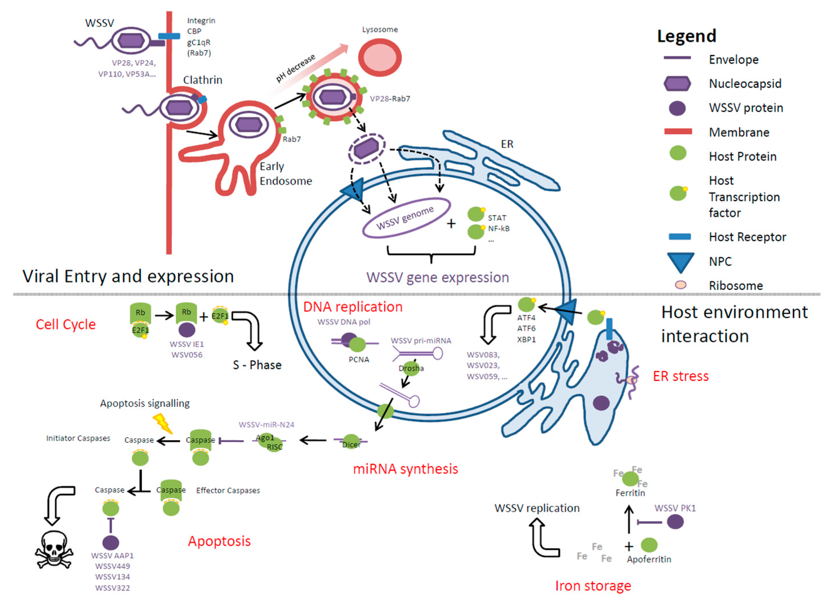 Overview of WSSV entry and environment interactions. Top panel: Viral entry into the host cell. WSSV proteins interact with host receptors, which leads to induction of Clathrin-mediated endocytosis. WSSV then travels through endosomes. During maturation the pH decreases, a cue for viruses to exit the endosomes. This stage probably involves an interaction between VP28 and Rab7. How WSSV passes through the nuclear envelope is unknown. Once in the nucleus, host transcription factors bind the WSSV genome (e.g., ie1) and initiate expression of viral genes. Bottom panel: Intracellular interactions between WSSV and the host cell. WSSV DNA replication requires host machinery (e.g., processivity factors) and to make these available WSSV can act to halt the cell cycle in the S-phase through E2F1. A high level of viral protein production can lead to ER stress, e.g., activation of unfolded protein response (UPR) pathways. Transcription factors of the UPR can activate expression of viral genes, which in turn may inhibit translation through eIF2. WSSV replication requires essential nutrients including iron. To prevent the host from withholding iron, WSSV can inhibit the binding of iron to Ferritin. WSSV can influence apoptosis signaling either through miRNA-mediated inhibition of initiator caspases or through viral proteins that inhibit effector caspase activity.