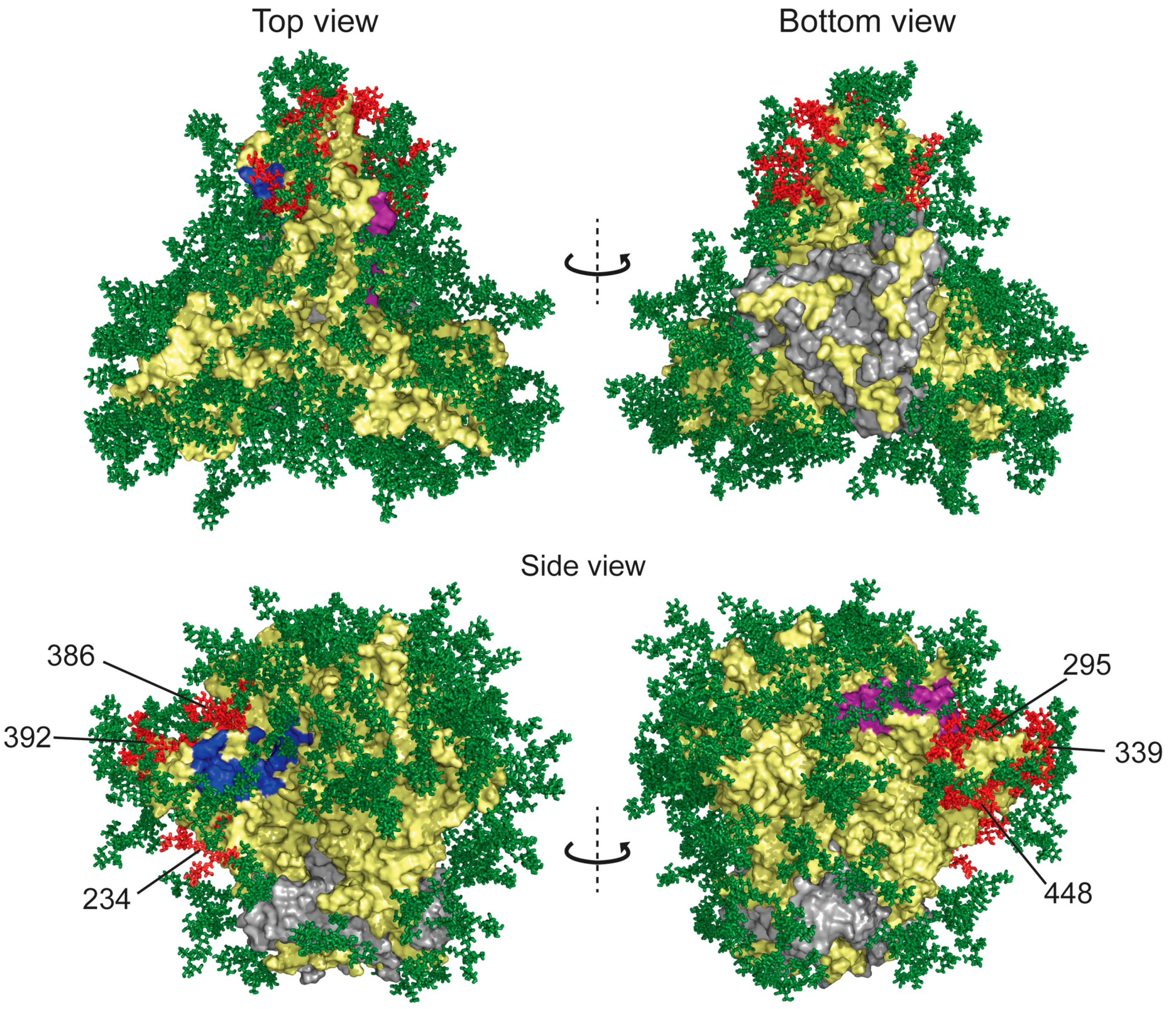 The importance of intermolecular crosslinking by GRFT has been suggested in several publications [18,19,20,21,26]. Evidence has been obtained from the protein perspective as well as from the glycan perspective. It has been shown that monomeric GRFT binds with comparable affinity to gp120, yet the IC50 for neutralization is several orders of magnitude weaker than wild-type GRFT [19]. Crystal structures with a synthetic nonamannoside have been obtained only for the monomeric GRFT construct. The mode of binding seen in the crystals was in disagreement with a model proposing all three terminal mannose units of Man9 interacting with each of the mannose-binding sites in GRFT [16,19]. The inability of Man9 to engage all three binding sites on GRFT was further supported by studies that showed that glycopeptides that mimic Man9 required distances greater than those separating the arms of natural Man9GlcNAc2 in order to engage all three binding sites simultaneously [26]. Most recently, cryo-electron microscopy and surface plasmon resonance studies of viral particles treated with GRFT or GRFT mutants demonstrated that the unique combination of multivalency, strict recognition of Man9 and homodimeric structure of GRFT led to bridging of viral particles and aggregation [27].