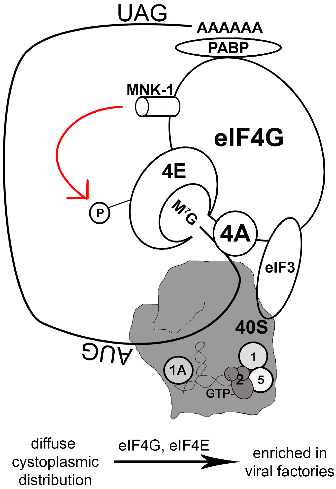 Regulation of the translation initiation complex by Mnk1 and the impact of vaccinia virus infection. For cellular or viral mRNAs containing the 7-Methylguanosine-cap structure (shown as M7G) on the 5’ end, recruiting host ribosomes to the mRNA is a critical event. The eukaryotic translation initiation factor 4F (eIF4F) (not shown) plays an important role in this process. eIF4F is a tripartite complex including a cap-binding subunit (eIF4E) (shown as 4E), a small RNA helicase (eIF4A) (shown as 4A), and a large scaffold protein (eIF4G) that directly interacts with the poly(A) binding protein (PABP) and a 40S-ribosome-associated protein (eIF3). The mRNA circulates by interacting with PABP at the 3’-end (depicted by a stop codon of UAG and the poly(A) tail of the mRNA) and associating with eIF4G at the 5’-end. The 43S preinitiation complex that consists of the small 40S ribosomal subunit (portrayed in a gray block at the back) and initiation factors, including eIF1 (shown as 1), eIF1A (shown as 1A), a ternary complex eIF2(α, β, γ)•GTP•met-tRNAimet (shown as 2, GTP, and a hairpin structure, respectively), and eIF5 (shown as 5), assembles with eIF4F complex, via eIF3, to form the 48S complex. One of eIF4E kinases, Mnk1, binds to eIF4G and phosphorylates eIF4E (the red arrow represents this phosphorylation event, and the 4E connected to P represents phosphorylated eIF4E). The assembled 48S complex can then scan the mRNA for start codon (AUG). Vaccinia virus (VACV) manipulates this process by enriching the concentration of eIF4G and eIF4E in the viral factories. VACV requires Mnk1 activity for infection.