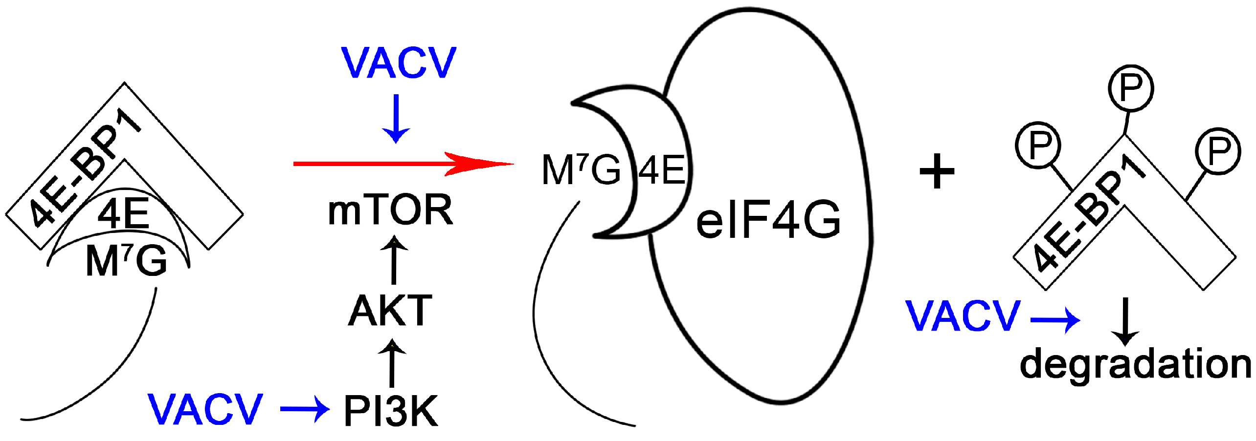Vaccinia virus manipulates 4E-BP to favor viral protein synthesis. Mammalian 4E-BP is a translation repressor by sequestrating the cap-binding protein eIF4E. The M7G and the line represent the 7-Methylguanosine-cap structure and mRNA, respectively. This inhibition can be lifted through phosphorylation of 4E-BP via PI3K/AKT/mTOR axis. Vaccinia virus (VACV) infection activates PI3K (blue arrows represent the activation action), which then stimulates mTOR signaling. In turn, mTOR mediates phosphorylation of 4E-BP (shown as Ps attached to the 4E-BP1 protein), lifting the block on eIF4E (shown as 4E). In addition to enhancing phosphorylation of 4E-BP1, VACV also reduces the abundance of 4E-BP1 possibly by promoting the degradation of phosphorylated 4E-BP1.