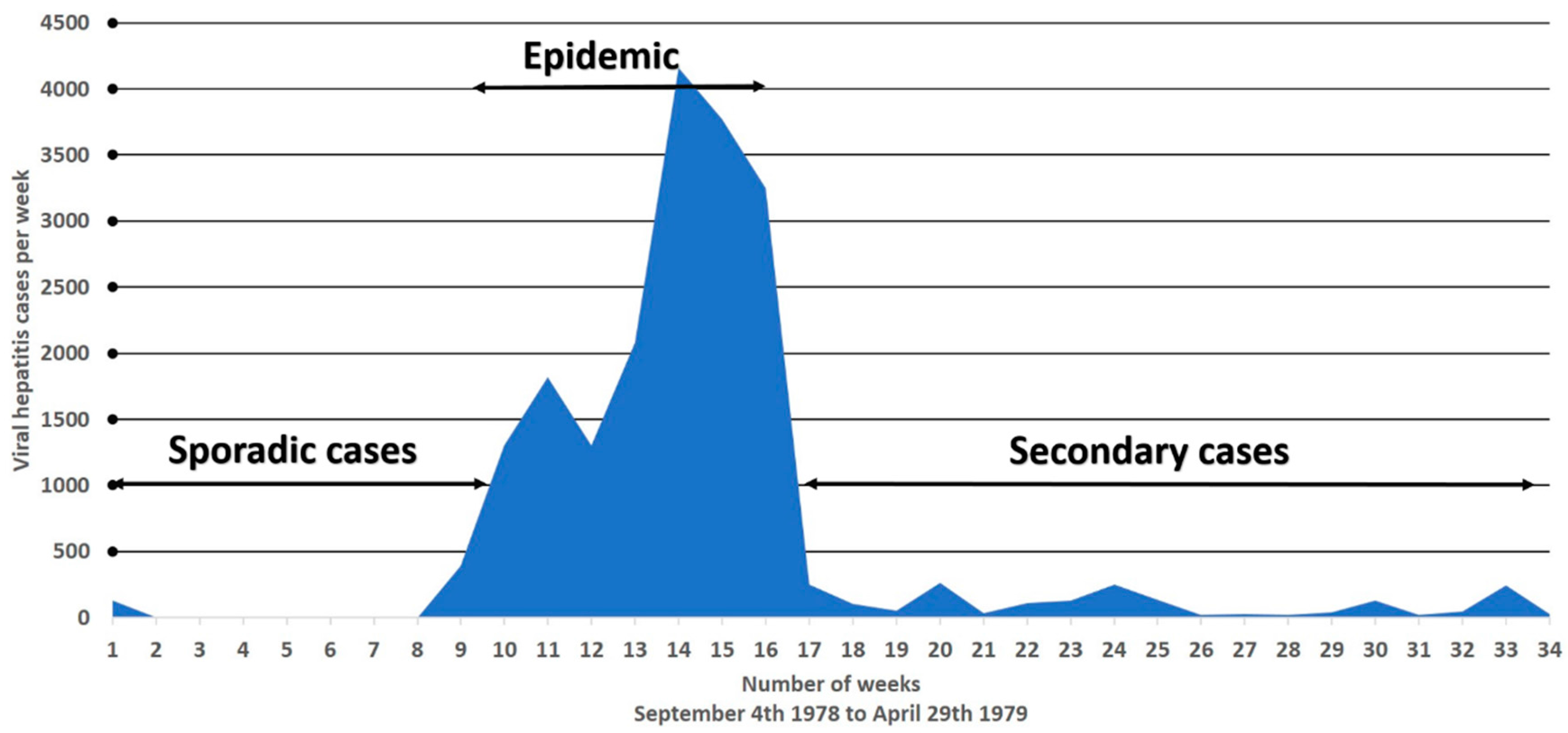Gulmarg Kashmir Epidemic, 1978–1979. Weekly occurrence of 20,083 hepatitis E cases reported from 200 villages (n = 600,000) from 4 September 1978 to 29 April 1979 (34 weeks). Epidemic curve lasted from the 8th to the 17th week (nine weeks). Prior to and following the epidemic, only isolated cases of hepatitis E were recorded, suggesting that person-to-person transmission was not of major consequence to the development of the epidemic.