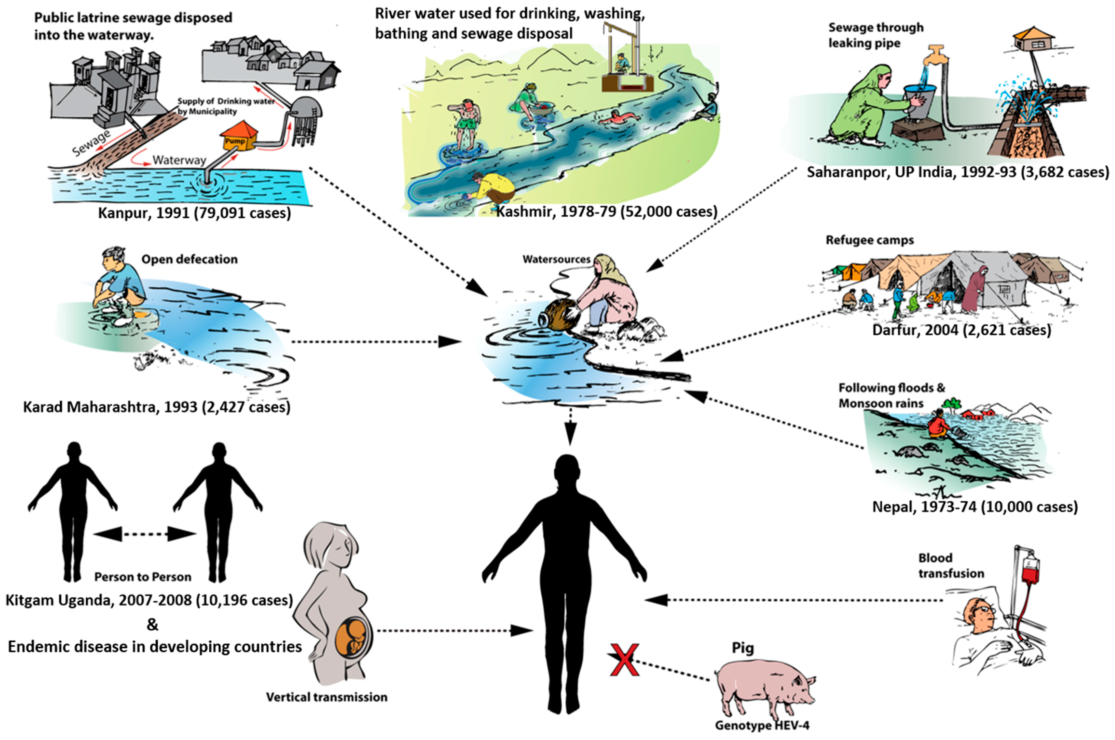 Unfortunately, even piped water can become contaminated in certain situations. Quite often, piped drinking water is supplied to towns and cities in India, with the common practice of laying the pipes along with the sewage drains, or even crossing the sewage channels. Worn-out pipes become cracked and can start forming holes; during intermittent water supply schedules, the sewage enters the pipe lumen, causing fecal contamination of piped water. Several epidemics of hepatitis E in India have reportedly been caused by this phenomenon [67,68,69,70]. Even more dangerous is when the city sewage drains change their course due to heavy rains and flooding and enter the water source for the same city, thus supplying the city sewage water for drinking. Epidemics of massive proportion involving hundreds and thousands of cases have been reported due to sewage drain contamination of city water supplies alone [57,58].