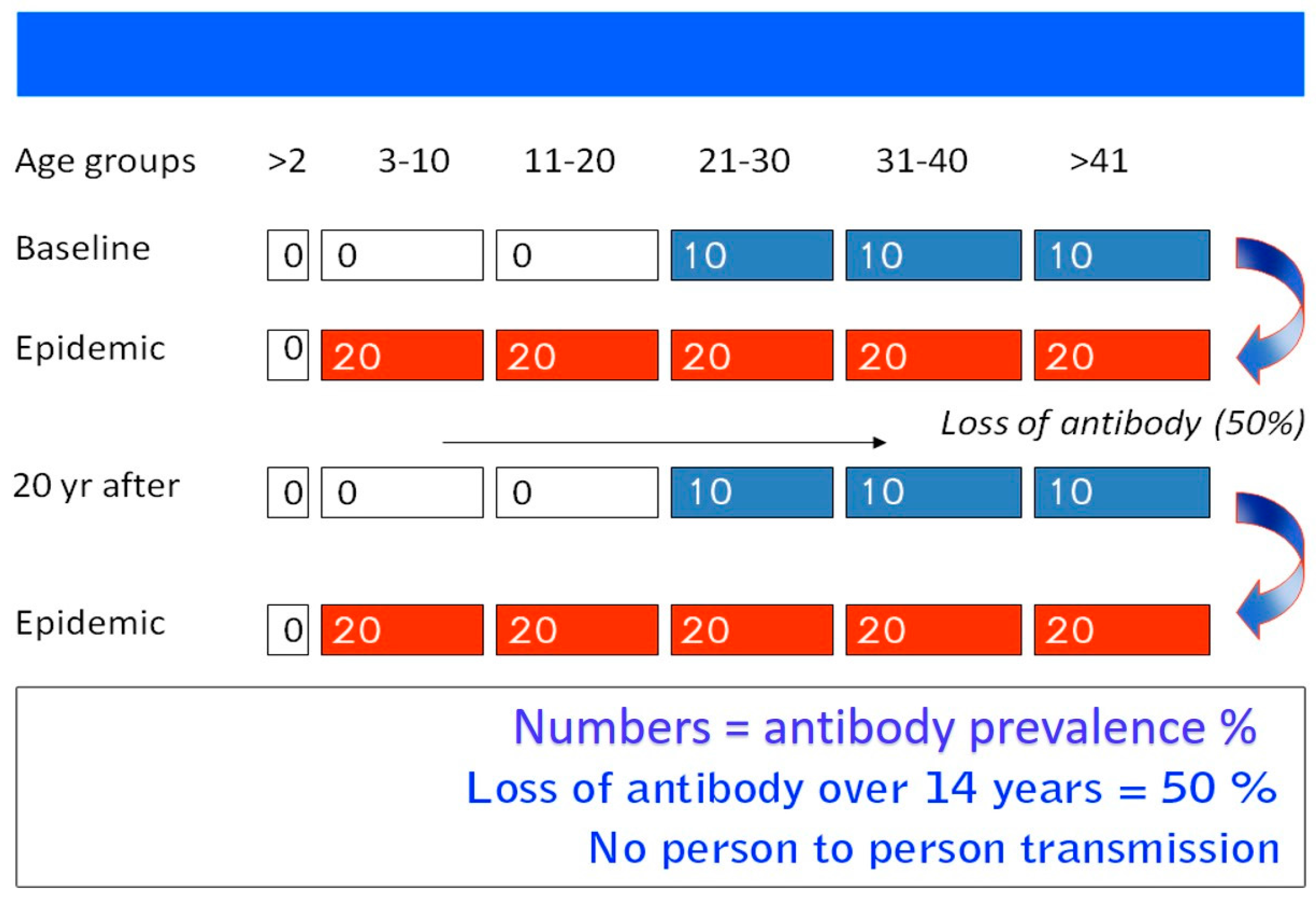One of the puzzling epidemiological features of hepatitis E is the fact that epidemics occur only periodically within the same geographical region, in spite of constant fecal contamination of water supplies (Table 1). For example, Kashmir, India has been under surveillance since the first epidemic of viral hepatitis was recorded and studied in 1978–1979. The first reported epidemic spread over 200 villages with 600,000 inhabitants; it amounted to 20,083 individuals with jaundice and 600 fatalities in a seven-week period (Figure 1). Initially, six epidemics occurred in adjacent regions on a yearly basis (1978 to 1984), all in the late autumn and early winter months when the fecal pollution of the waterways becomes concentrated, affecting a population of 1,937,000 individuals, and causing 53,307 cases of jaundice and 1752 deaths. Following this outbreak, a decade went by with no epidemics occurring within the population. However, in November of 2007, a second wave of epidemics was then recorded by Khuroo, et al. [39], who looked at the sero-epidemiology of this outbreak, comparing it to the first epidemic from 1978–1979. In 1993, 45 hepatitis E subjects infected in 1978–1979 were studied to determine the status of long-term IgG. Around half of the subjects with HEV infection had lost the antibodies over 14 years’ follow-up [38]. After a natural infection, IgG anti-HEV titers rise for four weeks, followed by a decline. Around 28%–67% of subjects have undetectable antibodies over a two-year follow-up [64,71]. Therefore, it is thought that periodic epidemics within a population is due to a cohort effect. During an epidemic, around one-fourth of the population becomes infected and show the presence of serum IgG anti-HEV. Following this, there is a gradual loss of antibodies over time and little exposure to HEV infection in the inter-epidemic period in a new cohort of the population. Once the herd immunity falls to a critical level, the next epidemic hits the community (Figure 4).