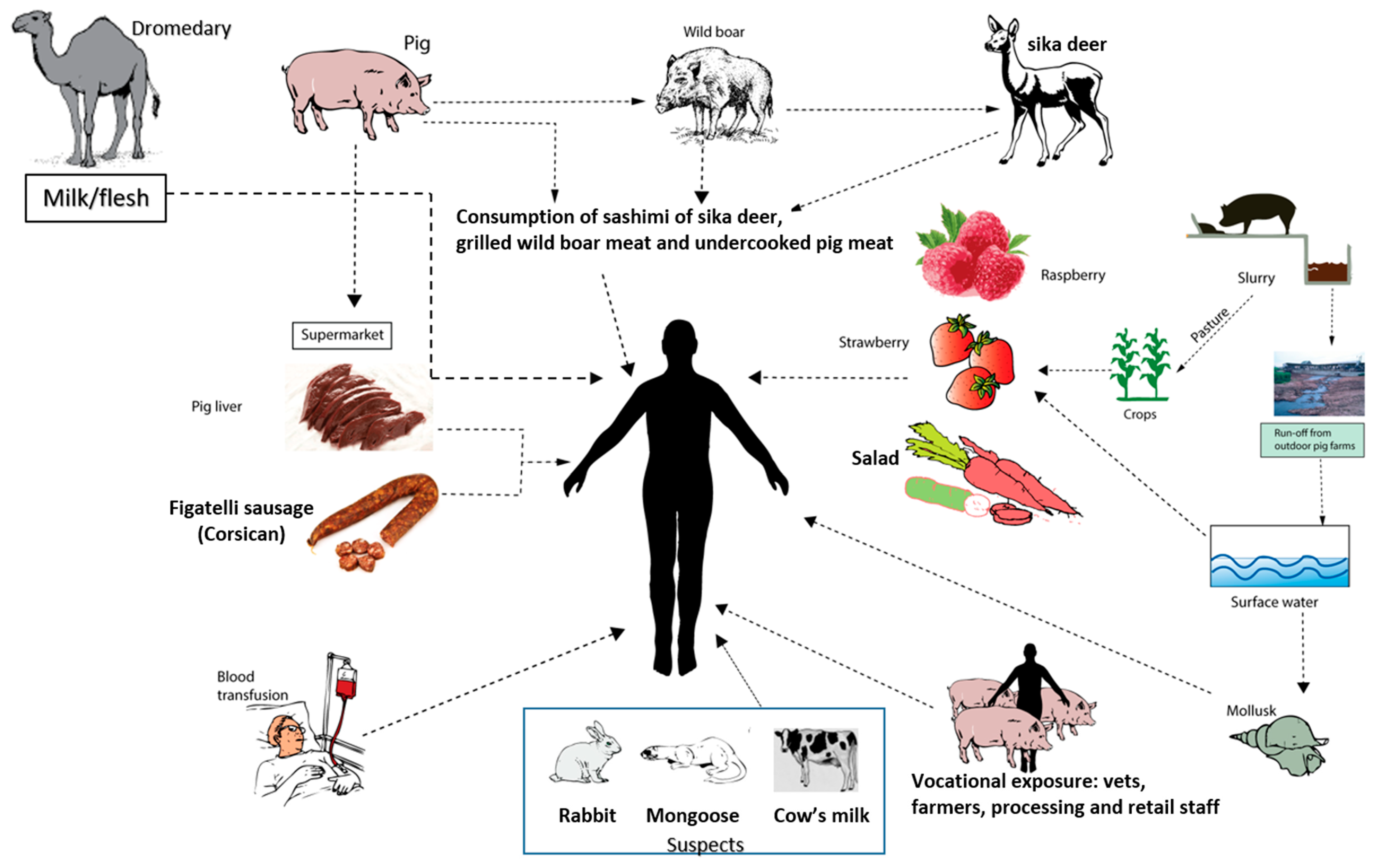 Hepatitis E is a zoonotic disease, and domestic pigs, wild boar, and sika deer are reservoirs for genotypes HEV-3 and HEV-4 [81]. Human infections occur through three methods, namely, zoonotic foodborne consumption, direct contact with infected animals, and environmental contamination by animal manure run-off (Figure 5) [82]. Food-borne zoonotic transmission of HEV-3 and HEV-4 has been well studied [56,82]. Wild boar, sika deer, and domestic pigs cross transmit HEV [83], and eating the parboiled flesh or liver (a delicacy in many countries) could be responsible for the autochthonous cases and outbreaks of hepatitis E [84]. A more common method of the spread of HEV is through consumption of raw livers from supermarkets or eating Corsican figatelli sausage in Europe [85,86,87]. Such livers and sausages are often infected with live HEV. Vocational exposure to domestic pig farms, manure, and sewage is also a significant risk factor in HEV infections in many countries [88,89,90]. Swine veterinarians as well as workers, were found to be 2 to 5 times more likely to be positive for IgG anti-HEV than non-swine veterinarians and the general population in many European countries [91,92,93,94]. Additionally, pig slurry can cause environmental contamination through several ways. Use of pig slurry as pasture can infect agricultural products like raspberries, strawberries, and many vegetables used in salad [95,96]. Run-off from outdoor pig farms causes contamination of surface water as well as produce receiving surface water [97,98].