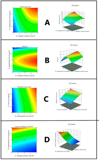 Contour and 3-dimensional response surface graphs of (A) particle size, (B) entrapment efficacy, (C) inhibition zone, and (D) serum creatinine.
