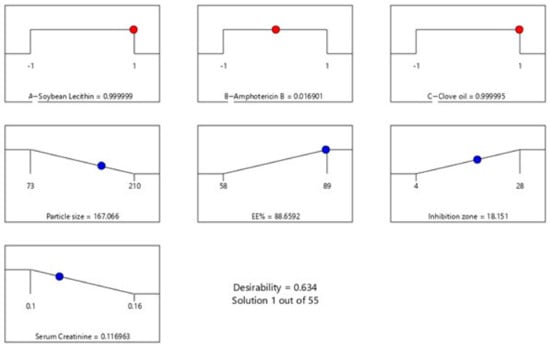 Lastly, the formulation of AMP-NT was optimized by setting the desired goals for each response and simultaneously applying the global desirability function (D). On the basis of these criteria, the desirability plot was generated with a D value of 0.634 (Figure 3). In conclusion, the optimized formulation was determined to be 300 mg/mL soybean lecithin, 200 mg/mL amphotericin B, and 150 mg/mL clove oil, resulting in a particle size of 155.09 nm, 84.30% EE, inhibition zone of 16.0889 mm, and 0.1197 mmol/L serum creatinine. those results showed no significant difference with the predicted results shown in Figure 3. For example the actual value for serum creatinine is 0.1197 mmol/L while the predicted value in the figure is 0.1169 mmol/L, which indicated no significant difference between predicted and actual values.