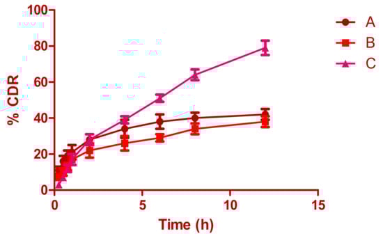 In vitro drug release profile from (A) amphotericin B released from aqueous suspension, (B) amphotericin B released from in situ gel loaded with drug aqueous suspension, and (C) amphotericin B released from optimized nanotransferosomal in situ gel.