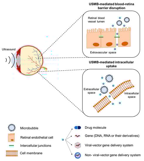 Microbubbles can also be used in therapeutic ultrasound applications. Microbubbles exposed to ultrasound waves undergo oscillations that induce various bioeffects on the surrounding structures. These bioeffects can be exploited to improve the local administration of drugs and genes. Recently, preclinical investigations of the therapeutic use of ultrasound and microbubbles (USMB) have been conducted in the field of ophthalmology, where there is a clear need for improved new delivery methods. The aim of this review is to provide an overview of the different therapeutic applications of USMB in ophthalmology (Figure 1). These can be divided into two distinct applications: (i) disruption of the blood–retina barrier and extravasation of drugs/genes that circulate in the bloodstream, and (ii) intracellular uptake of drugs/genes in various ocular cells.