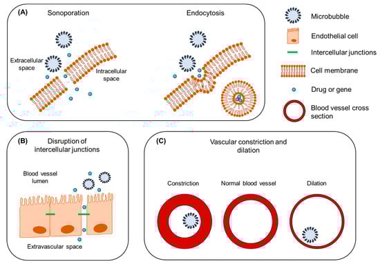 The mechanisms underlying the therapeutic use of USMB. (A) Intracellular uptake of drug/gene induced by sonoporation (left) and endocytosis (right). (B) Disruption of intercellular junctions and extravasation of drug/gene from blood vessel to the extracellular space. (C) Vascular constriction and dilation. Figure not to scale.