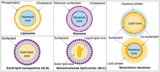 Nano- and microemulsions are the most famous colloidal dispersions. They are colloidal systems composed of two immiscible liquids. Both of these systems comprise an aqueous phase, an oil, a surfactant, and a cosurfactant or cosolvent [,]. Their nanoparticles have some basic structures with hydrophobic and hydrophilic cores, which are arranged according to the external phase []. They are generally classified as water-in-oil and oil-in-water emulsions. They can be prepared through spontaneous emulsification or by high-energy methods, i.e., micro-fluidization or high-pressure homogenization [,].
