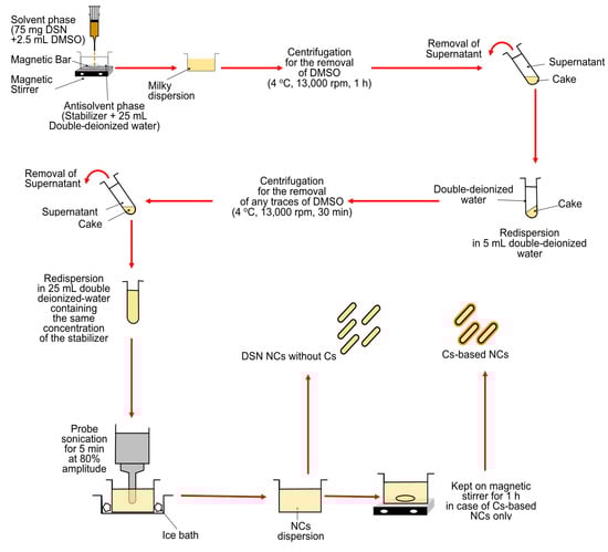 DSN nanocrystals (NCs) were prepared through procedures that combined the bottom-up technique of antisolvent precipitation and top-down method of probe sonication [,]. A schematic representation of the preparation method is illustrated in Figure 1. Briefly, DSN (75 mg) was dissolved in 2.5 mL dimethyl sulfoxide and added dropwise to 25 mL double-deionized water containing PVP K25, PLX188, and SDS, used individually as stabilizers at different concentrations of 0.1%, 0.15%, 0.3%, and 0.6% w/v (Table 1). The resultant dispersions were centrifuged at 13,000 rpm for 60 min at 4 °C using a cooling centrifuge (CE16-4X100RD, ACCULAB, New York, NY, USA). The obtained cake was washed with double-deionized water and recentrifuged for 30 min to remove any residues of dimethyl sulfoxide []. NCs were carefully collected and resuspended in the same concentration of each of the utilized stabilizers to be stabilized during storage []. Probe sonication has been reported to provide smaller and more homogeneous NCs due to the direct contact with the dispersion and the transfer of a high energy output rather than the energy spreading, as in the case of a bath sonicator []. As a preliminary study, different sonication amplitudes (50%, 80% and 100%) and times (2.5, 5 and 10 min) were tested and the smallest size reduction in NCs using the examined stabilizers at a concentration of 0.15% w/v was obtained by probe sonication at an 80% amplitude for 5 min (data not shown). Accordingly, NC dispersions were then sonicated using a probe sonicator (Serial No. 2013020605, Model CV 334) attached to a homogenizer (SONICS vibra cellTM, model VC550, sonic & materials Inc., Newtown, CT, USA) at 80% amplitude for 5 min and the temperature was kept constant using an ice bath [].