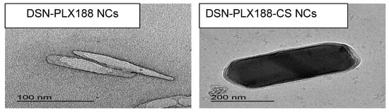 The morphology of the selected PLX188 and CS-PLX188 NCs examined using TEM is illustrated in Figure 2. DSN–PLX188 NCs appeared in the form of nanosized rods. TEM microphotographs showed the hydrodynamic layer of PLX188, which appeared as a grey layer surrounding NCs, reflecting the high affinity of the stabilizer towards the particle surface, providing steric stability. DSN–PLX188–CS NCs were larger nanometric rods surrounded by two layers of PLX188 and CS. It has been reported that cylindrical silica nanoparticles showed a higher accumulation in the liver than other shapes; thus, rod-shaped NCs can be expected to accumulate in the hepatic tissue and augment the therapeutic efficacy of the incorporated drugs [].