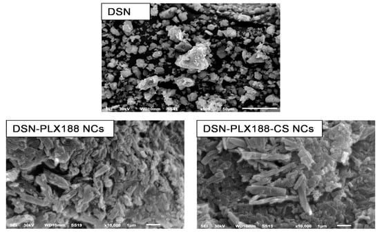 The surface morphology of DSN powder and its selected NCs, employing PLX188 either alone or combined with CS, is presented in Figure 3. DSN showed microparticles with irregular shapes and a wide size distribution. In accordance with TEM examination, SEM images of DSN NCs based on either PLX188 or a PLX188–CS combination revealed nanometric rods with a smooth and uniform surface. Similar results have been reported elsewhere [,]. It has been found that sonoprecipitation could provide rod-shaped NCs that exhibited higher in vitro dissolution rates and bioavailability when compared to spherical ones with a similar hydrodynamic diameter []. Moreover, rod-shaped NCs can be expected to greatly accumulate in the liver and potentiate the therapeutic efficacy of the incorporated drugs []. Both SEM and TEM findings may indicate the benefits of our study over that previously adopted regarding DSN nanosuspension based on HPMC that incorporated oval-shaped crystals with one layer of a steric stabilizer adsorbed on their surfaces [].