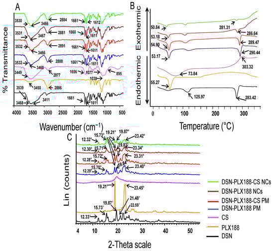 FT-IR spectroscopy was applied to assess the possibility of the interaction between DSN, PLX188, and CS. Figure 4A depicts the FT-IR spectra of DSN powder, PLX188, CS, and PMs of DSN and PLX188 with and without CS as well as the lyophilized PLX188 and PLX188–CS DSN NCs. The FT-IR spectrum of DSN exhibited characteristic bands at 3411, 3468, and 3539 cm−1 due to more than one O–H aromatic bond stretching as well as an absorption band at 1661 cm−1, corresponding to aromatic ketonic carbonyl stretching (C=O vibration) [,]. The stretching of (C=C) in the DSN aromatic ring resulted in two peaks at 1611 and 1502 cm−1 []. PLX188 had characteristic stretching vibration peaks at 3450 and 2886 cm−1, assigned to –OH and –CH3, respectively []. CS exhibited a characteristic strong and broad peak at 3449 cm−1 due to hydroxyl and amine group stretching vibrations. It also exhibited an absorption peak at 2877 cm−1 which may be attributed to C–H stretching. The peaks at 1656, 1030 and 1077 cm−1 corresponded to –C=O of the residual acetyl group, C–O and C–H groups, respectively. The band at 895 cm−1 was due to the β-(1,4) glucoside bond in CS []. The characteristic peaks of the drug and the polymer(s) were present in FT-IR spectra of the PMs of DSN and PLX188 either alone or together with CS; thus, no interaction between DSN and any of these polymers could be expected on physical mixing. FT-IR spectra of lyophilized DSN NCs based on either PLX188 or a PLX188–CS combination were similar to that of the corresponding PM. Hence, it can be suggested that the stabilizers were physically adsorbed on DSN NCs without a chemical interaction.