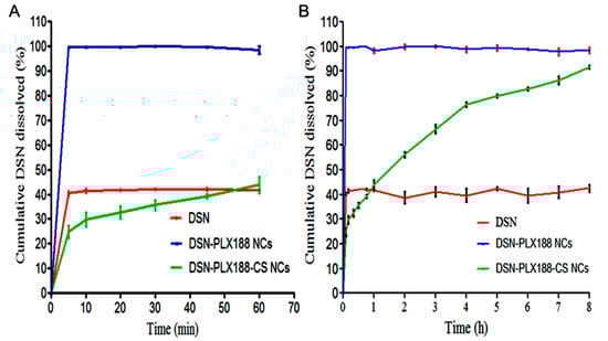In vitro DSN dissolution up to (A) 60 min and (B) 8 h from the selected NCs based on PLX188 alone and the PLX188–CS combination in comparison with the drug in a sodium orthophosphate buffer (pH 12), employing the paddle method. Data are expressed as the mean ± SD (n = 3).