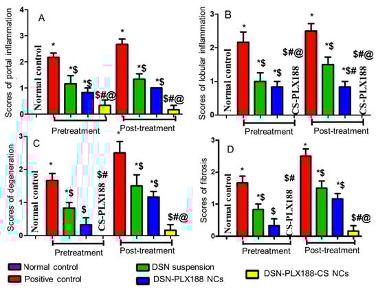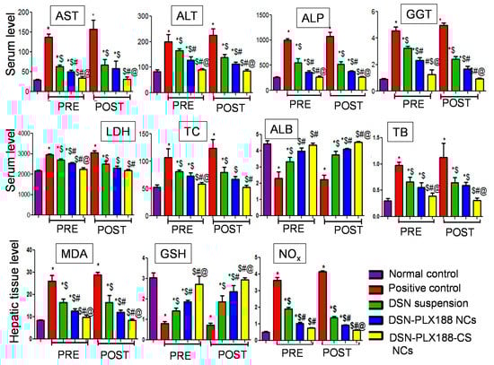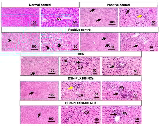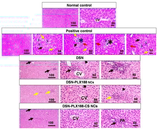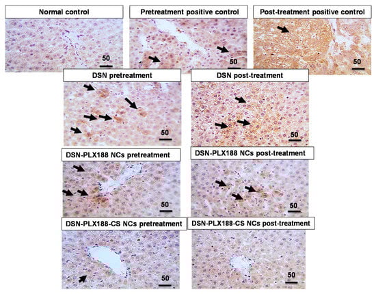 Therefore, the aim of this study was to improve DSN dissolution and delivery after oral administration. To fulfill this target, DSN NCs were developed, combining steric and electrostatic stabilization strategies aiming to attain enhanced NC stabilization and therapeutic efficacy. In vitro evaluation of the selected NCs was attempted. Furthermore, the effects of the selected DSN NCs on the therapeutic efficacy against ferrous sulfate-induced liver damage in rats were investigated through serum and tissue biomarker assessments, histopathological examinations, and the immunohistochemical localization of inducible nitric synthase (iNOS).