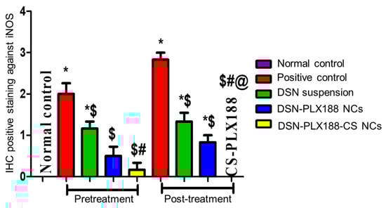 iNOS is one of the three key enzymes that generate nitric oxide from the amino acid L-arginine; hence, increased iNOS activity indicates tissue damage []. iNOS evaluation was accomplished according to an immuno-enzymatic staining method []. This method is based on the binding of primary antibodies to its antigen in examined tissue sections, followed by binding the biotinylated secondary antibodies to the primary antibodies. Then, an enzyme–conjugate binds to the biotin on the secondary antibodies to be detected by a substrate–chromogen mixture with a color intensity depending on the activity of the bound enzyme.