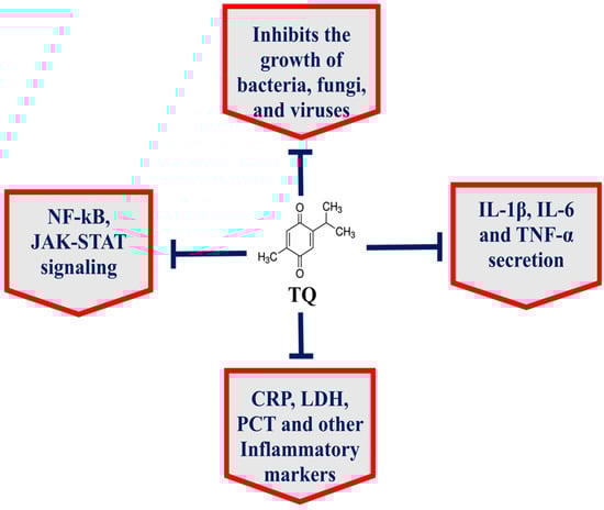 The seeds of Nigella sativa, commonly known as black seed or black cumin, have been widely used in the Arabic, Ayurveda, Chinese and Unani systems of medicine [,,] because N. sativa has numerous nutritional and medicinal benefits against cancer, diabetes, asthma, hypertension and eczema [,]. The black seed contains many important phytoconstituents, including thymoquinone, thymohydroquinone, dithymoquinone, carvacrol, thymol, nigellicine, nigellidine, p-cymene, etc. []. Thymoquinone (TQ), a chief constituent of black seed, targets multiple cell signaling pathways and has potential therapeutic implications in many diseases (Figure 1) []. Importantly, TQ exhibited the broad-spectrum antimicrobial activity against various pathogens, including bacteria, fungi and viruses []. Moreover, TQ effectively inhibited biofilm formation in bacterial and fungal pathogens [,,]. Interestingly, TQ inhibited the functioning of the drug efflux pumps in bacteria, including Pseudomonas aeruginosa, Staphylococcus aureus and Bacillus cereus []. In addition to their activity against bacteria and fungi, black seed and TQ also exhibited activity against many viruses, including mouse hepatitis virus (MHV)-A59, cytomegalovirus, hepatitis C virus (HCV) and avian influenza virus [].