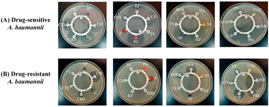 Antibiotic susceptibility screening of (A) drug-sensitive and (B) drug-resistant A. baumannii.