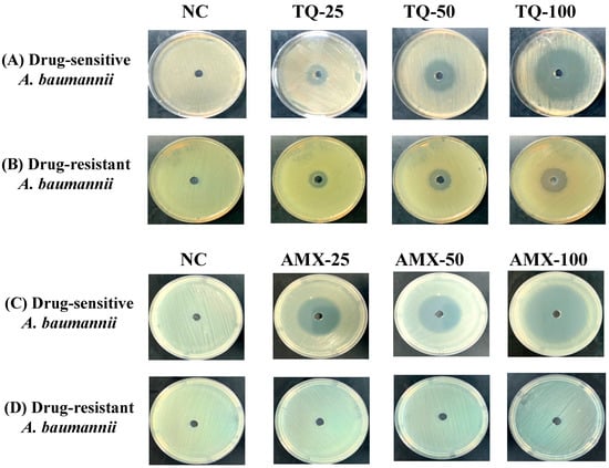 TQ demonstrated very strong activity against the drug-sensitive and drug-resistant A. baumannii (ATCC 19606) as well. The wells containing 25, 50 and 100 μg of TQ exhibited 15-, 24- and 42-mm inhibition zones against drug-sensitive A. baumannii (Figure 3A), whereas the wells containing the same amounts of TQ exhibited 12-, 18- and 25-mm growth inhibition zones in the plates streaked with drug-resistant A. baumannii (Figure 3B). On the other hand, amoxicillin (AMX) demonstrated its strong activity against the drug-sensitive, but not against the drug-resistant A. baumannii (Figure 3C,D). The wells containing 25, 50 and 100 μg of AMX exhibited 30-, 35- and 50-mm growth inhibition zones against drug-sensitive A. baumannii (Figure 3C), whereas drug-resistant A. baumannii (ATCC 19606) did not exhibit any susceptibility to AMX at the given concentrations (Figure 3D).