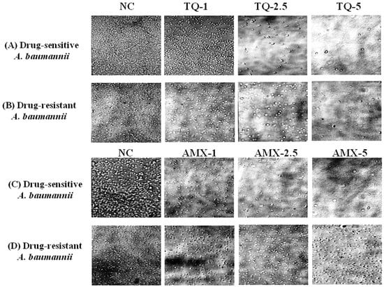 The activity of TQ or AMX against the drug-sensitive and drug resistant A. baumannii was analyzed using microscopic analysis. The results revealed that TQ had strong activity against the drug-sensitive and drug-resistant A. baumannii, whereas AMX was effective against the drug-sensitive, but not the drug-resistant A. baumannii. TQ exhibited a dose-dependent activity against the drug-sensitive and drug-resistant A. baumannii as well (Figure 4A,B). However, AMX was highly effective against drug-sensitive A. baumannii, but it was ineffective against drug-resistant A. baumannii (Figure 4C,D).