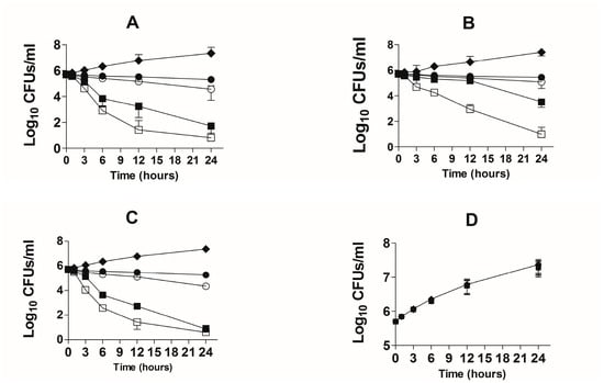 Time-kill curves of TQ or AMX at the doses of 1, 2, 4 and 8 µg/mL against the drug-sensitive and drug-resistant A. baumanni. Time-kill curves of TQ against the (A) drug-sensitive and (B) drug-resistant A. baumannii. Time-kill curves of AMX against the (C) drug-sensitive and (D) drug-resistant A. baumannii. The data are represented as the means ± SD of three independent experiments. Control (♦), TQ—1 µg/mL or AMX—1 µg/mL (●), TQ—2 µg/mL or AMX—2 µg/mL (○), TQ—4 µg/mL or AMX—4 µg/mL (■), TQ—8 µg/mL or AMX—8 µg/mL (☐).