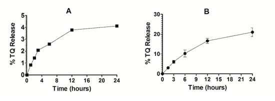 The release kinetics of TQ from the liposomal formulation was determined by incubating the mixture consisting of one volume of Lip-TQ with nine volumes of human serum. The reaction mixtures were incubated for 1, 2, 3, 6, 12 and 24 h at 37 °C as described earlier []. The mixture was centrifuged at 12,000× g for 15 min. The amount of TQ released from Lip-TQ into the serum was estimated as a percentage of total TQ present in the liposomes initially added to the serum.
