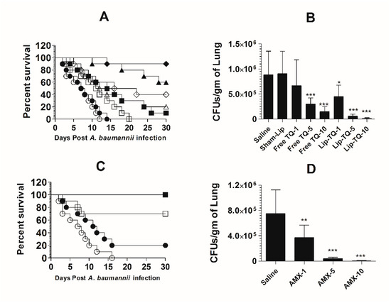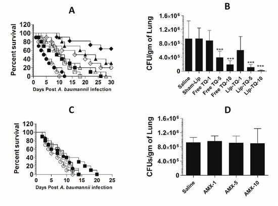 Lip-TQ or AMX effectively eliminated the drug-sensitive A. baumannii infection in a murine model. (A) Each mouse was infected with 1 × 107 CFUs of A. baumannii through an intravenous dose. After 12 h of the infection, the mice were treated with 1, 5 and 10 mg/kg of free TQ and Lip-TQ for seven consecutive days. The mice were monitored for 30 days for the survival. Saline (○), sham-Lip (●), free TQ—1 mg/kg (☐), free TQ—5 mg/kg (△), free TQ—10 mg/kg (◊), Lip-TQ—1 mg/kg (■), Lip-TQ—5 mg/kg (▲), Lip-TQ—10 mg/kg (♦). Saline vs. free TQ—1 mg/kg (p = 0.0271), sham-Lip vs. Lip-TQ—1 mg/kg (p = 0.009), free TQ—5 mg/kg vs. Lip-TQ—5 mg/kg (p = 0.0195), free TQ—10 mg/kg vs. Lip-TQ—10 mg/kg (p = 0.0195). (B) The bacterial load (CFUs) was determined as described in the methodology section. The data are represented as the means ± SD of three independent experiments. * p < 0.05, *** p < 0.001. (C) The mice infected with drug-sensitive A. baumannii were treated with AMX (1, 5 and 10 mg/kg) for seven days and their survival rate was observed on day 30 after the infection. Saline (○), AMX—1 mg/kg (●), AMX—5 mg/kg (☐), AMX—10 mg/kg (■). Saline vs. AMX—5 mg/kg (p = 0.0023), saline vs. AMX—10 mg/kg (p < 0.001). (D) The bacterial load (CFUs) was determined as described in the methodology section. The data are represented as the means ± SD of three independent experiments. ** p < 0.01, *** p < 0.001.