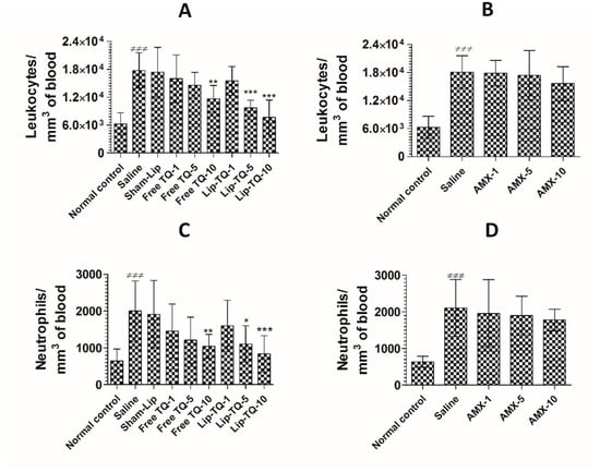 Treatment with Lip-TQ, but not with AMX, alleviated the parameters of total leukocytes and neutrophils in the mice infected with drug-resistant A. baumannii. On day 5 post-treatment, the blood was sampled from three mice and the leukocyte and neutrophil counts were analyzed. (A) Leukocytes in the free TQ- or Lip-TQ-treated mice, (B) leukocytes in the AMX-treated mice, (C) neutrophils in the free TQ- or Lip-TQ-treated mice, (D) neutrophils in the AMX-treated mice. The data are represented as the means ± SD of three independent experiments. ≠≠≠ p < 0.001. Normal control vs. saline-treated mice, * p < 0.05, ** p < 0.001, *** p < 0.001. Saline vs. free TQ or Lip-TQ treatment groups.