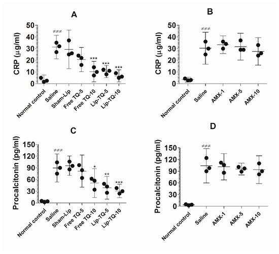 Treatment with Lip-TQ, but not with AMX, alleviated the parameters of the CRP and PCT in the mice infected with drug-resistant A. baumannii. On day 5 post-treatment, the blood was sampled from three mice and the levels of the CRP and PCT were analyzed. (A) The CRP in the free TQ- or Lip-TQ-treated mice, (B) the CRP in the AMX-treated mice, (C) PCT in the free TQ- or Lip-TQ-treated mice, (D) PCT in the AMX-treated mice. The data are represented as the means ± SD of three independent experiments. ≠≠≠ p < 0.001. Normal control vs. saline-treated mice, * p < 0.05, ** p < 0.001, *** p < 0.001. Saline vs. free TQ or Lip-TQ treatment groups.