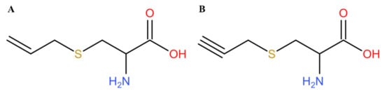 The chemical structure of (A) S-allyl-cysteine (SAC) and (B) S-propargyl-cysteine (SPRC).