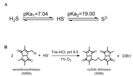 The mechanism for the detection of H2S. (A) The acid dissociation constant of H2S; (B) the mechanism of monobromobimane (MBB) reaction with HS− to produce SDB in an alkaline and hypoxia environment.