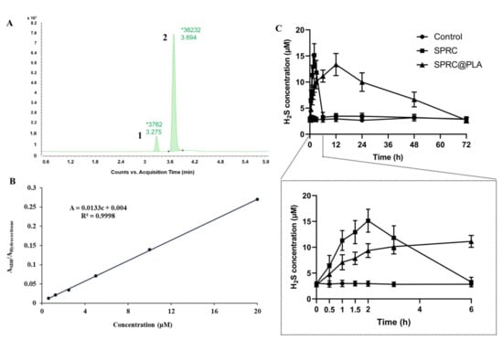 Generally, H2S is unstable, and can exist as the mixed state of hydrogen sulfide (H2S), hydrogen sulfide anion (HS−), and sulfide anion (S2−) under physiological conditions (Figure 1A). It has been reported [,] that H2S, HS−, or S2− could react quickly with MBB to produce a relatively stable SDB in a Tris-HCl buffer (pH 9.5) under 1% oxygen (Figure 1B). It would be much easier to detect the SDB rather than the H2S in vivo. Herein, the LC-MS was adopted for the measurement of SDB in vivo, which could indirectly reflect the equal amount of H2S in vivo. Two peaks, as shown in Figure 5A, indicated effective separation of SDB (Peak 1) and internal standard (Peak 2). Then, the calibration curve was calculated with a concentration range from 0.625 to 20 μM, (Figure 5B) which indicated a good linear correlation of this method. The SPR promoted H2S release in vivo in a fast manner, while SPRC@PLA sustained the elevated plasma H2S concentration, as shown in Figure 5C. Instantaneous H2S production and metabolism could be observed within 6 h after a single injection of SPRC solution. Differently, SPRC@PLA slowly elevated the plasma H2S concentration, which was potentially induced by the sustained SPRC release from SPRC@PLA.