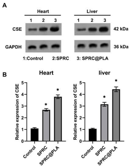 The SPRC has been reported to be able to promote the H2S release in vivo through the CSE/H2S signaling pathway, according to our previous studies [,], and the CSE mainly distributed in heart and liver [,,,]. The expression of CSE in the heart and liver were investigated and the increased expression could be found in both SPRC and SPRC@PLA groups. The SPRC@PLA group showed a higher expression of CSE than the SPRC group both in heart and liver, mainly because of the sustained release of SPRC from SPRC@PLA (Figure 6).