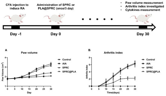 The AIA rat model was established via the injection of CFA (10 mg·mL−1), according to the manufacturer’s instructions. In total, 30 rats were randomly divided into four groups as follows: Control group (n = 5), no intervention; AIA group (n = 5), injection of 100 μL of CFA; SPRC group (n = 5), after injection of 100 μL of CFA, further subcutaneous injected with 2 mL of SPRC solution every 3 days for 30 days; SPRC@PLA group (n = 5), after injection of 100 μL of CFA, further subcutaneous injected with 2 mL of SPRC@PLA suspension every 3 days for 30 days (the amounts of SPRC used were all equivalent to 100 mg·kg−1 of SPRC.)