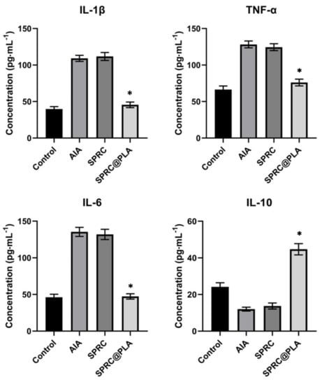 As illustrated in Figure 8, SPRC showed a negligible anti-inflammatory effect in AIA rats as compared with the model group, while a dramatic decrease in pro-inflammatory cytokines and an increase in anti-inflammatory cytokines could be observed in the SPRC@PLA group.