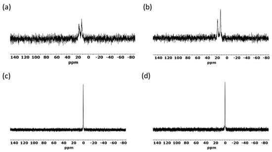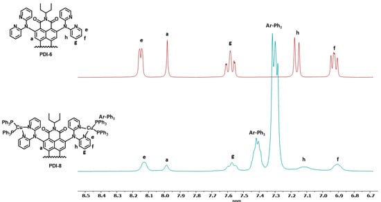 In the case of silver complexes, PDI-3 and PDI-7, the 31P{1H} NMR spectrum showed a broad doublet at 12.02 and 17.12 ppm, respectively, due to the coupling of the phosphorus atom with the two silver isotopes 109Ag and 107Ag, corresponding to the average coupling. The copper complexes PDI-4 and PDI-8 showed a signal at −0.5 ppm in the 31P{1H} NMR spectrum in agreement with the presence of equivalent phosphorus atoms (Figure 3).