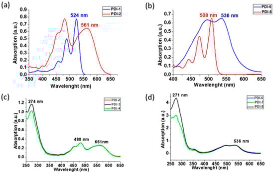 Normalized absorption in CHCl3 as solvent at 25 °C of (a) PDI-1 and PDI-2, (b) PDI-5 and PDI-6, (c) PDI-2, PDI-3 and PDI-4, and (d) PDI-6, PDI-7 and PDI-8.
