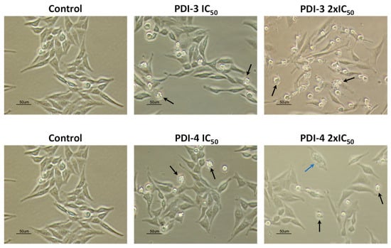Phase contrast microscopy images of HeLa cells untreated (control) and treated with PDI-3 and PDI-4 at concentrations equal to the IC50 and 2 × IC50 µM for 24 h. Black arrows point to apoptotic cells and blue arrow to necrotic cells.