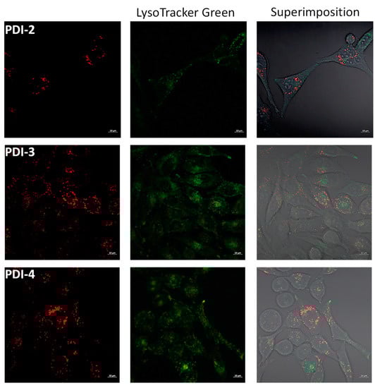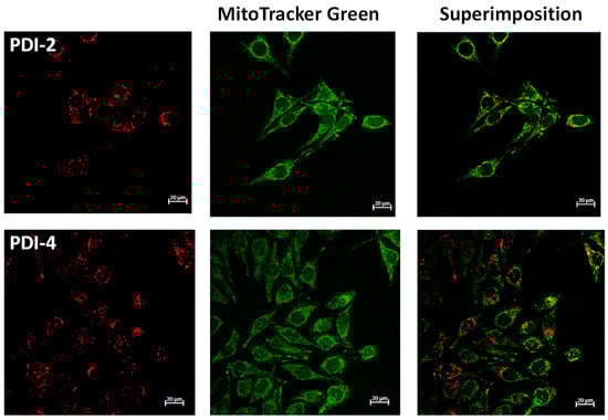 Cell biodistribution of the ligand PDI-2 and the metal complexes PDI-3 and PDI-4 was studied in HeLa cells. Quenching of the luminescent properties in the tetra-metallic complexes precluded the analysis of the biodistribution in cancer cells. A colocalization assay was performed where the ligand PDI-2 and the copper complex PDI-4 were incubated with HeLa cells together with a commercially available selective dye for a specific organelle as internal standard. The superimposition of the images obtained from the internal standard with those of the study compounds provides the cellular internalization of the compounds.