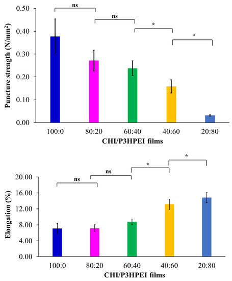 Mechanical properties of CHI and their blends with P3HPEI. Statistically significant differences are given as: *—p < 0.05; ns—no significance.