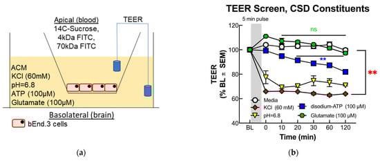 Consistent with prior reports, we found that high extracellular K+, acidified pH, and ATP reduced TEER and functionally allowed the paracellular uptake of small molecules [44,45,46,47]. In contrast, glutamate at sub-physiological levels and above reported levels for CSD did not change TEER values, suggesting it did not contribute to BEB permeability under these conditions. This observation is at odds with the prior reports showing that glutamate at supraphysiologic concentrations (>100 μM–10 mM) reduced TEER and increased BBB permeability [48,49]. Notably, ATP induced rapid changes in TEER, but a delayed effect on functional BEB perturbations; these observations were consistent with those of Maeda et al. [44]. They proposed that ATP acts to increase the secretion of matrix metalloproteases, which have been implicated in BBB permeability during headaches [50]. Thus, the transient permeability of the BBB during CSD as reported is likely attributable to microenvironment levels of K+, pH, and ATP.