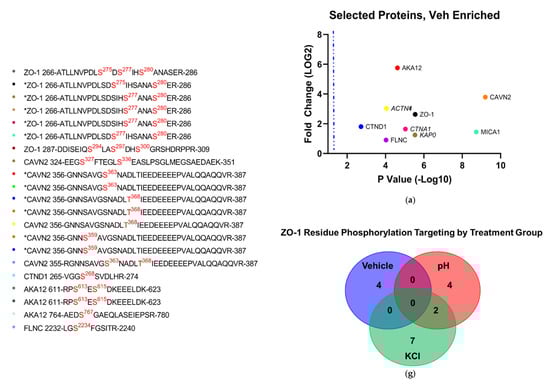 Scatterplots of significantly enriched phosphorylated proteins against physiologically associated proteins significantly enriched in phosphorylation following (a) vehicle, (c) acidified pH, and (e) 60 mM KCl insult. Individual fold change plots of phosphorylation-site enrichment, separated by (b) vehicle-enriched, (d) acidified pH-enriched, and (f) 60 mM KCl-enriched phosphorylation; individual dots on these plots correspond to listed verified detected PTM sites. When separated by treatment group, unique patterns of phosphorylation of ZO-1 can be identified by individual treatment, indicating PTM-regulated protein trafficking converges on this protein. Italicized proteins in scatterplots lacking verifiable phosphorylation sites were not included in individual fold change plots. Individual phosphorylated residues are colored red and superscript indicates position of phosphorylated amino acid; residue sequences marked with an asterisk indicate isobaric phosphorylation sites and were graphed as individual iterations of phosphopeptide enrichment. (g) Venn diagram illustrating overlap of phosphorylation adduct sites on ZO-1 residues by treatment group.