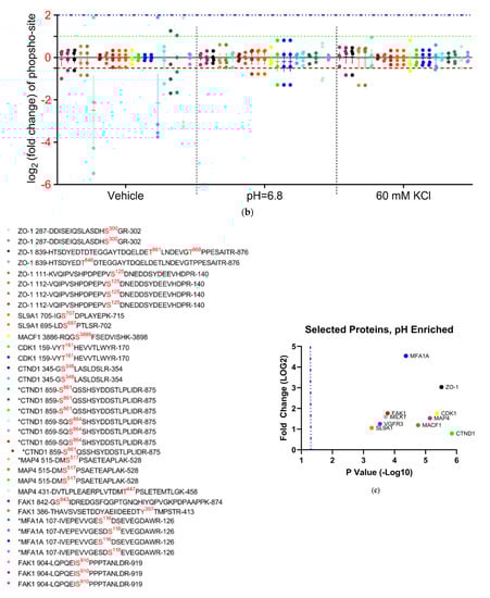 Proteins were assessed for both total and specific phosphorylation-enriched residues on the peptide chains comprising their primary structure. Highly enriched proteins associated with TJ or cytoskeletal function were separated by treatment group and visualized by scatterplot comparing Log2 transformed FE of phosphorylation against the −Log10 transformation of p-values (Figure 8a,c,d). Proteins phosphorylated at residue positions verifiable in UniProt were then plotted by comparing the −Log2 transformation of their fold enrichment score to each iteration of a unique phosphorylated residue. Proteins were assessed for fold enrichment of phosphorylation per treatment and plotted by highest overall level of phosphorylation enrichment by treatment. The locations of phosphorylated residues are also shown.