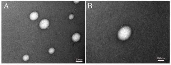 The 2C5 antibody-modified micelles were prepared according to our previously published paper []. The prepared micelles were imaged with a transmission electron microscope (TEM). Figure 1 shows the images of the micelles at 10,000× and 20,000× magnification in panels A and B, respectively. The images obtained via TEM corresponded to the size data published in a previous study [].
