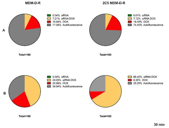 Cells (2 × 105) for both cell lines were seeded in a 6-well plate and allowed to grow overnight. Cells were incubated with the nanoparticles containing doxorubicin and FAM-labeled siRNA for 15, 30, 45 and 60 min in serum complete media. Later, the cells were detached using trypsin and washed with PBS (pH 7.4) for three times and resuspended in 200 μL of PBS. The cellular association of nanoparticles was evaluated using flow cytometry (Beckton Dickinson FACS CaliburTM, Piscataway, NJ, USA) by measuring the fluorescence of FAM-siRNA. The fluorescence signal was excited using a 488 nm laser and the emission was recorded using a standard FL-1 filter (λ = 530 nm) and FL-3 filter (λ = 585 nm). A total of 10,000 gated living cell events were collected.