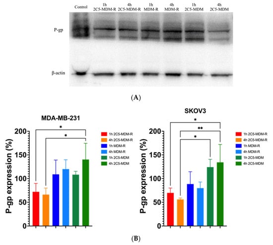 P-gp downregulation measured using Western blot; (A) representative Western blot gel image, (B) densitometry analysis with the 2C5-modified micelles in both MDA-MB-231 and Skov-3TR cells. Results indicate ± SD (n = 3), and significance was calculated with one-way ANOVA comparisons. ** p ≤ 0.01, * p ≤ 0.05.