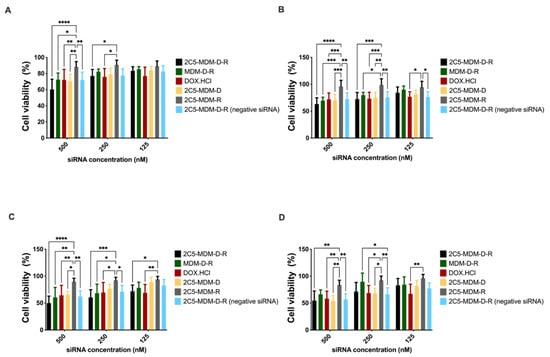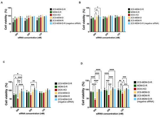 Finally, cytotoxicity studies in monolayer models were performed on MDA-MB-231 and SKOV-3TR cell lines. Figure 6 and Figure 7 show cytotoxicity data for MDA-MB-231 and SKOV-3TR cell lines, respectively. We treated the cells with our formulation for 1 and 2 h and changed the media and left the cells to recover for 23, 22, 47 and 46 h. Figure 6A,B show the MDA-MB-231 cells when treated for 1 and 2 h and recovered for 23 and 22 h, respectively. There was a dose–response relationship and a significant targeting effect of the 2C5-modified nanoparticles. Figure 6C,D are the cytotoxicity data for MDA-MB-231 cells after 1 and 2 h of treatment and 47 and 46 h of recovery. There was a dose–response relationship in both the treatment and recovery times. There was also a targeting effect observed in the longer recovery times as well. The control treatment groups 2C5-MDM-D, 2C5-MDM-R and 2C5-MDM-D-R (negative siRNA) have considerably lower cytotoxicity in comparison to 2C5-MDM-D-R. The cytotoxic response was also increased in the 2C5-MDM-D-R group in the longer recovery times. Cytotoxicity studies on monolayers were also performed on SKOV-3TR (Figure 7). As with MDA-MB-231 cells, we treated SKOV-3TR cells at the same dosage range. Figure 7A,B show the SKOV-3TR cells treated for 1 and 2 h and 23- and 22-h recovery times, respectively. A similar concentration range of siRNA has a relatively higher significant effect in MDA-MB-231 in comparison to SKOV-3TR cell line. Figure 7C,D show the SKOV-3TR cells treated for 1 h and 2 h with 47 and 46 h of recovery respectively. The targeted (2C5-MDM-D-R) and non-targeted (MDM-D-R) formulations have significantly higher cytotoxicity than the control groups. We can also observe that the doxorubicin groups in the longer recovery times for SKOV-3TR have a higher cytotoxicity than the other groups under study. This higher cytotoxicity can be due to the sensitivity of SKOV-3TR to doxorubicin in comparison to the MDA-MB-231 cell line. The cytotoxicity of doxorubicin in longer recovery times for MDA-MB-231 is lower than the cytotoxicity observed in SKOV-3TR (Figure 6 and Figure 7). In addition, 500 nM of siRNA concentration showed higher cytotoxicity in all the incubation and recovery time points in the 2C5-MDM-D-R nanoparticles. The cytotoxicity data show that the formulation is safe and effective.