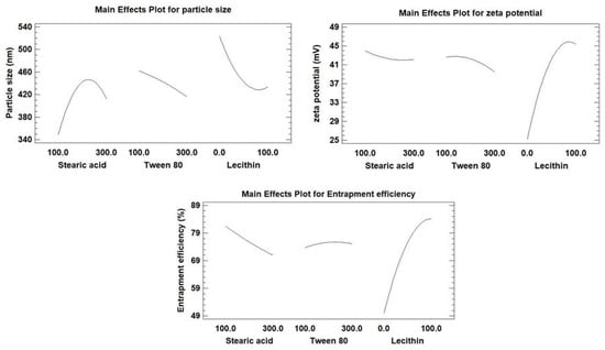 The compositions and observed response values of 15 experimental runs, including triplicate center points, are shown in Table 2. Multiple regression analysis using Statgraphics software together with a two-way ANOVA was employed for the statistical examination of BBD equations. The estimated factor effects and p-values for the three ANOVA-generated results are shown in Table 3. Figure 1 displays the major effect plots of the factors on the examined responses. The effect is deemed significant if a factor effect deviates from zero and the p-value is less than 0.05. A positive sign refers to a synergistic effect of a factor, i.e., a direct relationship between the effect of the factor and the tested response